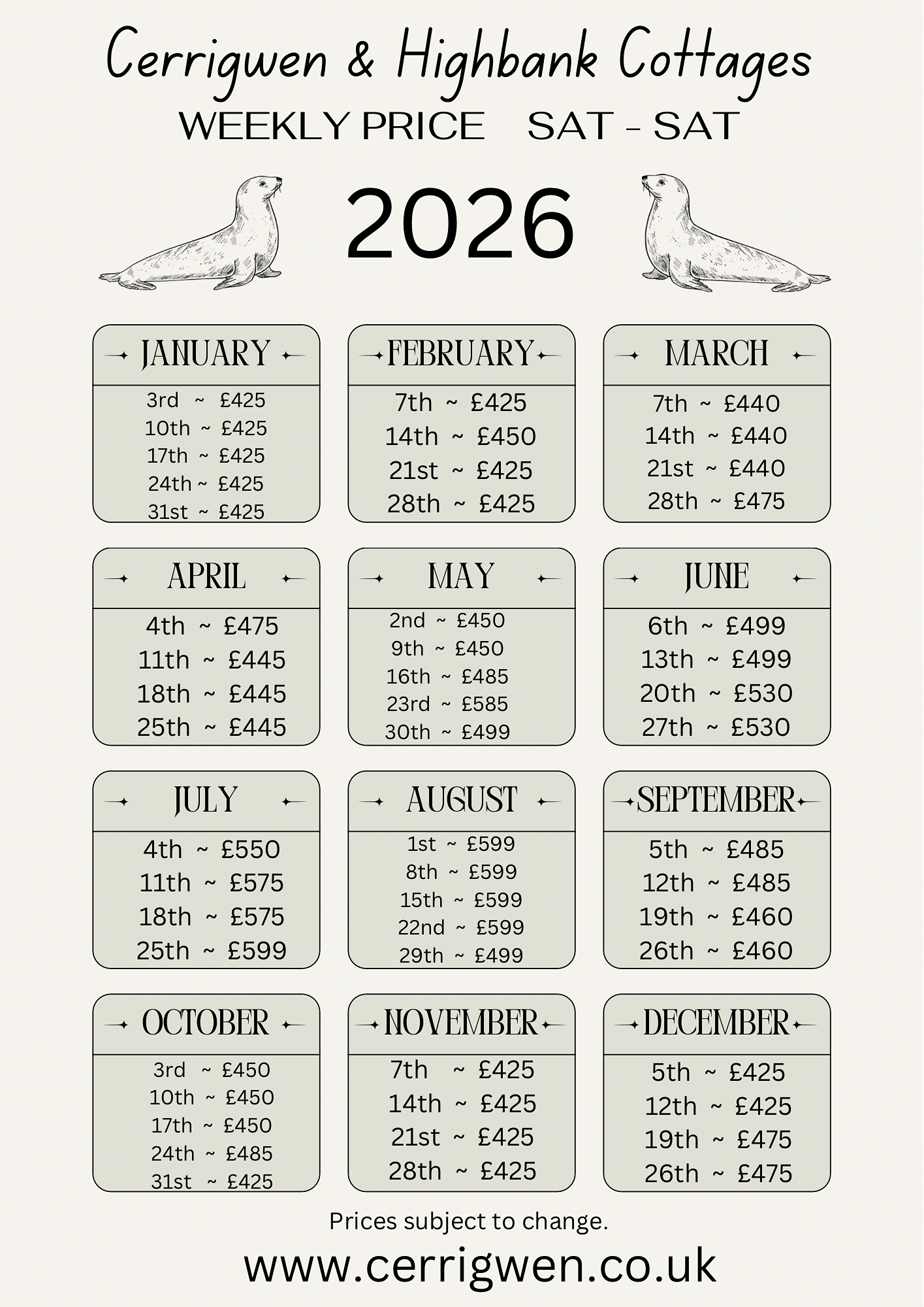 Cerrigwen & Highbank Cottages 2026 Weekly Price List